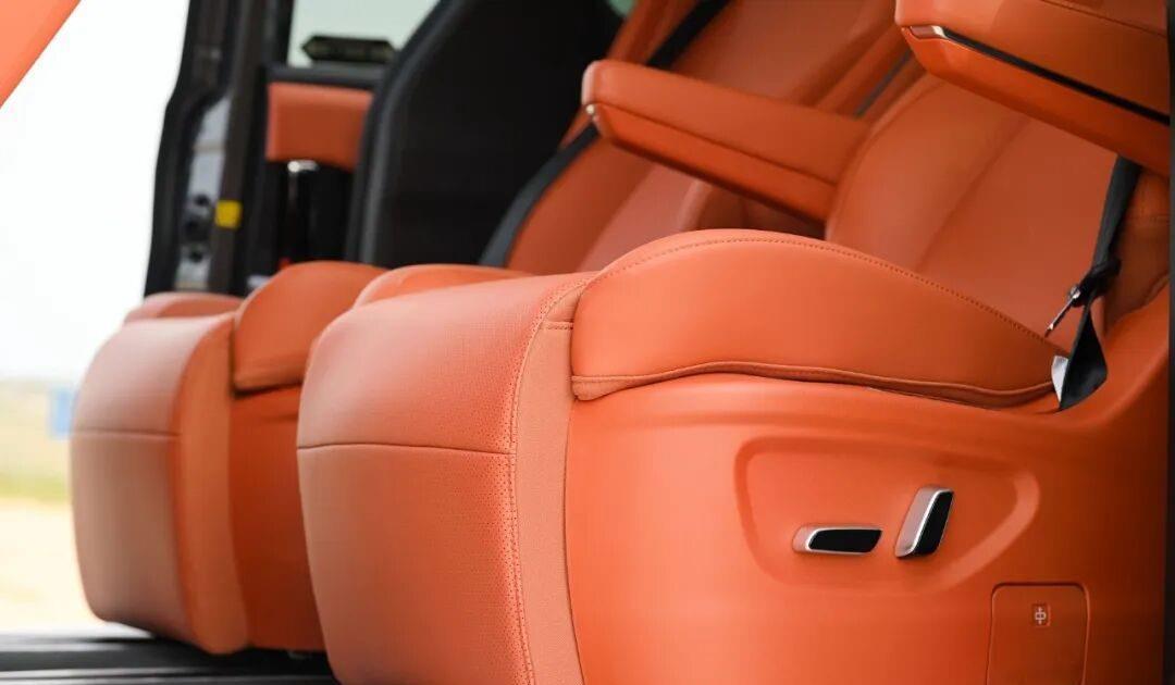 车内围绕“星舰环抱座舱”打造,由悬浮中控岛台一直延伸构建抱围合空间,并配备拱桥镂空扶手箱。车内基本被软包材质覆盖,质感出色,皮质座椅采用环保材料,格纹缝线体现了不错的工艺水平。